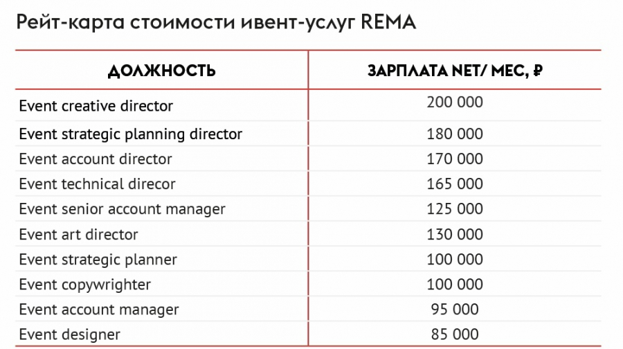 Также эксперты ассоциации REMA подготовили рейт-карту ивент-услуг. У агентств данного сегмента есть уникальные позиции, свои циклы изменений зарплат на различных должностях и другие особенности.