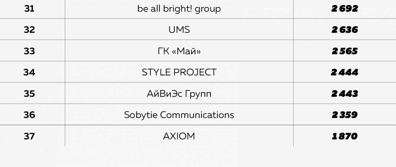 Первую строчку ESR занял холдинг маркетинговых коммуникаций ARK Group. Комиссия присвоила ему 6 778 баллов. На втором месте — The Diversity Group с 6 506 баллами. Замыкает тройку лидеров агентство Beetl, которое получило 6 070 баллов.