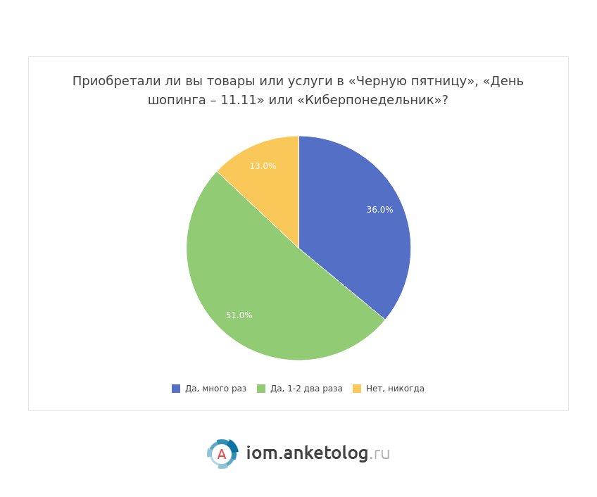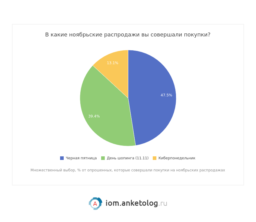 87% опрошенных россиян совершали покупки в дни ноябрьских распродаж, причём 36% делали это неоднократно, и только 13% ни разу не занимались шопингом в эти дни. Наибольшей популярностью у россиян пользуется «Чёрная пятница» — в период этой распродажи товары приобретали 75% тех, кто в целом участвовал в таких акциях ноября. 63% покупали что-либо в распродаже «11.11», а наименее восребованным оказался для россиян «Киберпонедельник» (21%), следует из данных опроса «Анкетолога».