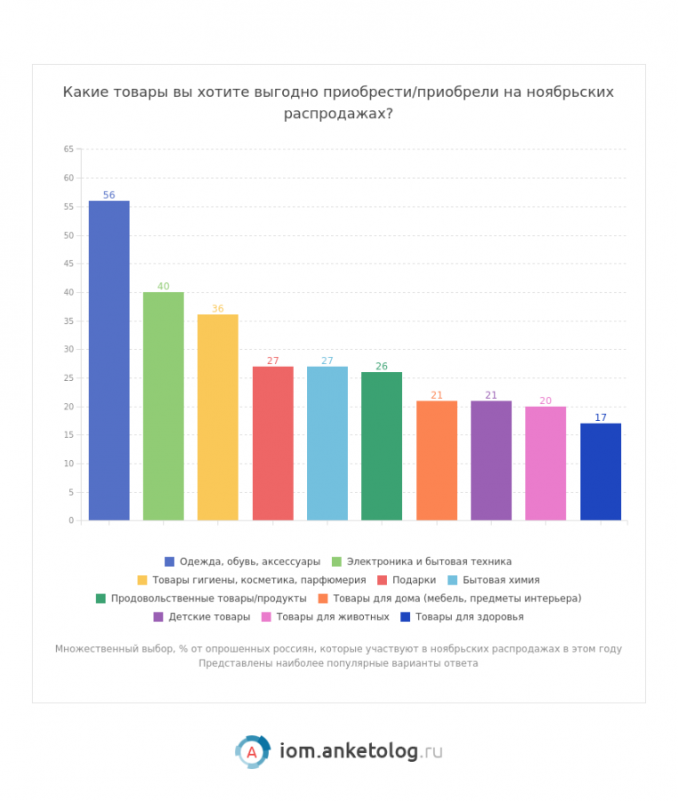Чаще всего потребители планируют купить одежду или обувь (56% опрошенных), электронику и бытовую технику (40%), косметику и парфюмерию (36%). Кроме того, 27% опрошенных планируют купить подарки, а ещё 27% — бытовую химию.