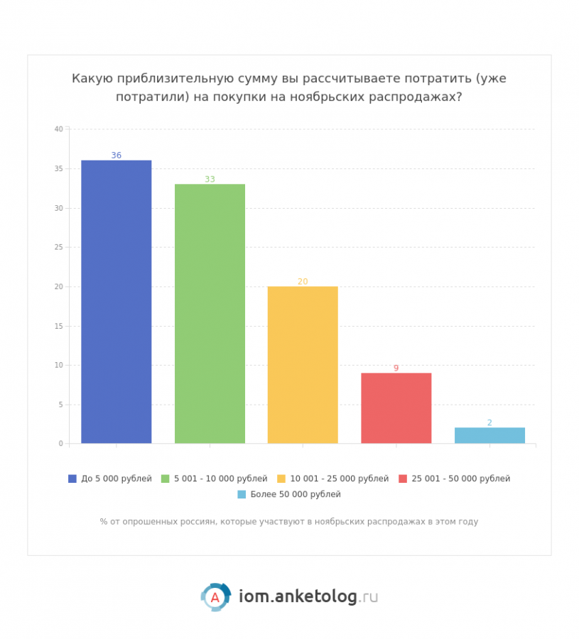 Более трети россиян (36%) готовы потратить менее 5 тыс. руб. на товары со скидками, почти столько же (33%) — от 5 до 10 тыс. руб. Каждый пятый планирует сделать покупки на сумму от 10 до 20 тыс. руб., 9% — от 25 до 50 тыс., а 2% планируют потратить более 50 тыс. руб.