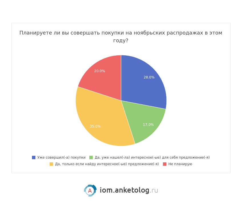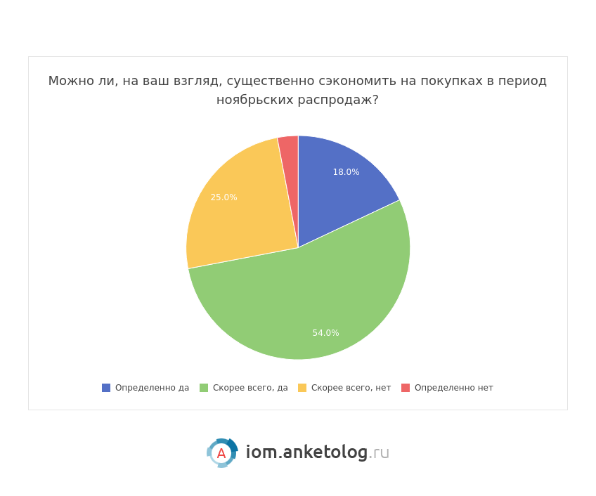 В этом году 35% опрошенных россиян готовы совершить покупку в одну из ноябрьских распродаж, если найдут интересное предложение, 28% уже занимались шопингом в эти дни, а 17% уже нашли для себя привлекательное предложение для приобретения товара. Порядка 72% согласны с тем, что в период распродаж можно существенно сэкономить.
