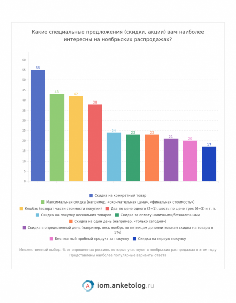 Также большинство опрошенных (55%) привлекают скидки на конкретный товар, 43% предпочитают предложения «окончательная цена» и «финальная стоимость», 42% привлекают предложения с кешбэком. 38% нравятся акции «Два по цене одного», 24% выбирают скидку на несколько товаров, 23% выберут скидку за выбор способа оплаты, например, за безналичную оплату, и ещё для 23% привлекательны предложения одного дня, например, «скидка только сегодня».