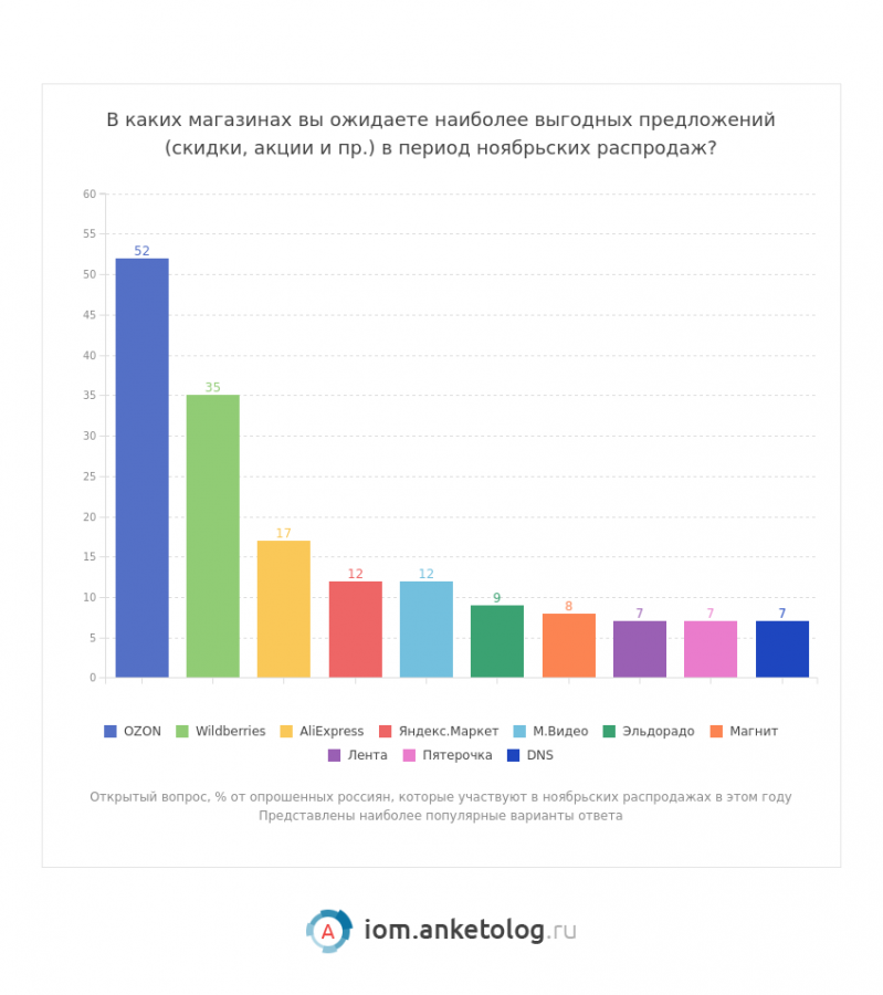 Далее аналитики опросили только тех, кто подтвердил участие в ноябрьских распродажах этого года. Главными площадками для покупок среди россиян стали маркетплейсы: Ozon (52%), Wildberries (35%), AliExpress (17%), «Яндекс Маркет» (12%). Также респонденты ожидают распродаж в «М.Видео» (12%), «Эльдорадо» — 9%, в магазинах сети «Магнит» — 8%.