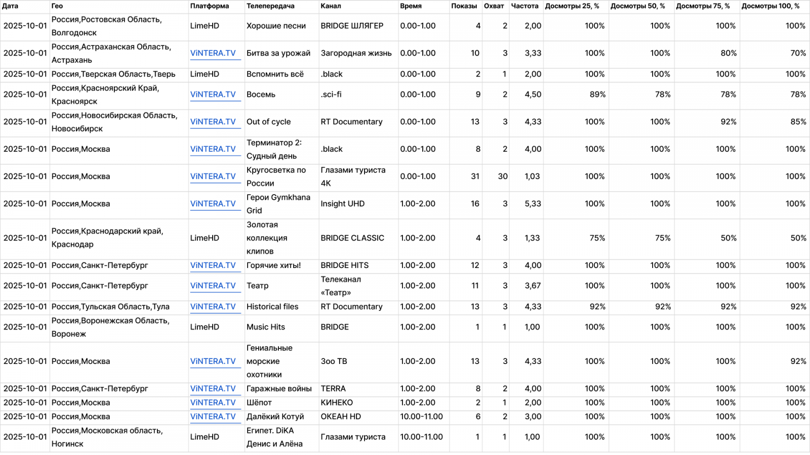В результате автоматизированной обработки этих данных и обогащения их своими данными, а также данными из EPG (электронная программа передач) о телепередачах формируется отчет по каждому рекламному флайту. В отчете показы разбиты в разрезе телепередач, каналов и тайм-слотов. Отчет содержит данные о количестве показов и охвате аудитории по каждой телепередаче, как зрители досматривали рекламу в разрезе квартилей (в абсолютном и в относительном значениях).