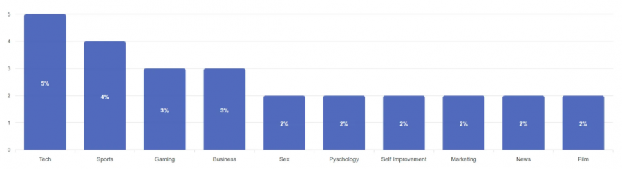 Наиболее популярные темы — технологии, бизнес и стартапы. Доля рассылок об искусственном интеллекте выросла с 4% до 6%, тогда как о программировании — снизилась. Технологии сместили спорт с лидирующих позиций, в топ-10 вошли бизнес, маркетинг и новости, а тематика путешествий выпала из первой десятки.