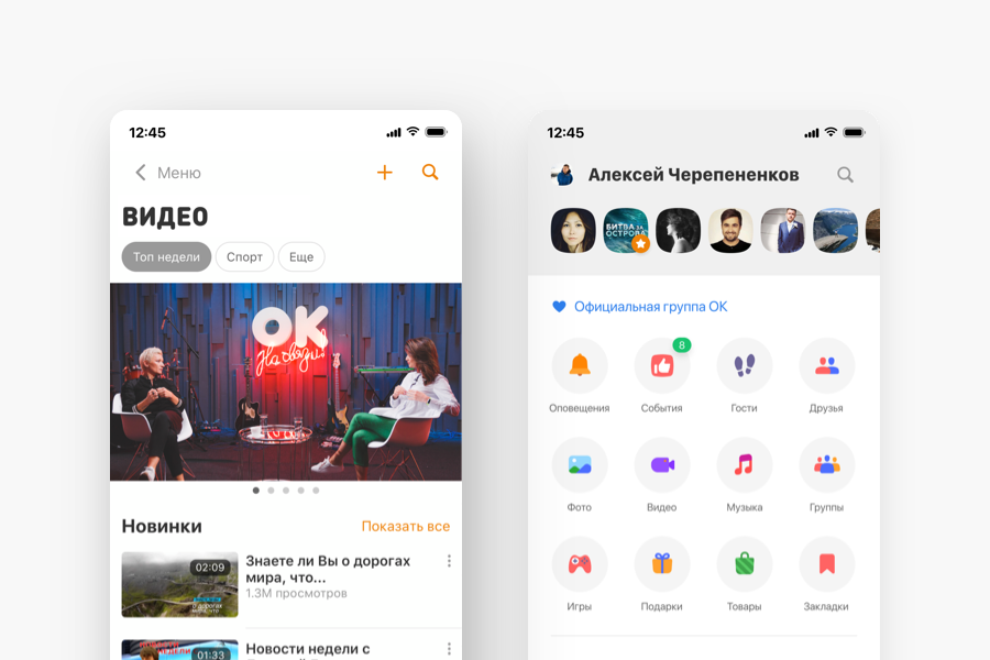 Теперь фирменный оранжевый цвет ушел на второй план, уступив место белому. В течении всего 2018 года «Одноклассники» разрабатывали дизайн-концепты, которые позволили бы одновременно сделать продукт простым и современным.