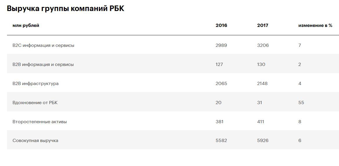 Совокупная выручка группы компаний РБК в 2017 году составила 5,926 млрд руб., что на 6% больше, чем годом ранее. Рост доходов от бизнес — сегментов, основанных на рекламной модели, составил 7%. Рост EBITDA — 20% (1052 млн рублей), операционная прибыль достигла 654 млн, что на 39% больше показателя прошлого года, сообщается в финансовом отчёте.