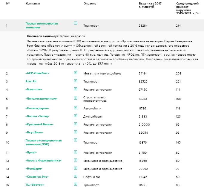 В список попали еще три ритейлера с доходами более 100 млрд руб. в 2017 году — сети «Лента» (365 млрд руб.), «Красное & Белое» (210 млрд руб.) и «Детский мир» (101 млрд руб.). Представителей крупного бизнеса из других отраслей в списке не оказалось. Интересно отметить, что список чемпионов роста обновился почти на 90%. Среди новичков — «Бристоль», «Эркафарм», «ВсеИнструменты.ру» и Royal Flight.