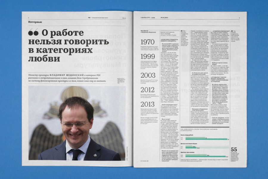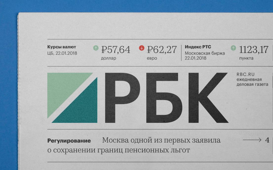 Фирменные шрифты РБК — Graphik и Kazimir Text — в газете получили свою специализацию: в качестве текстового шрифта используется Graphik, а для выносных и акцидентных элементов — Kazimir.