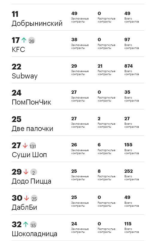 Впервые спал интерес к франшизе суши-ресторанов. Так, «Суши Шоп», прежде занимавший 5-ю, а затем 11-ю позицию в рейтинге, в этот раз «долетел» до 27-й строчки. Новых игроков в этом сегменте практически нет. Компания «Додо Пицца», главная звезда 2017 года, также упала с 2-го места на 29-е. Эксперты объясняют спад динамики открытия новых точек компании тем, что в 2017 году она продала франшизу во все крупные города России, кроме Грозного, и у компании просто осталось мало свободных локаций для открытия франшизных заведений.