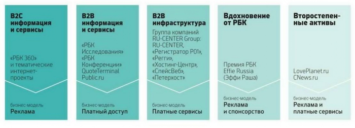 В сегмент «B2B информация и сервисы», основанный на платном доступе, входят «РБК Исследования», «РБК Конференции», QuoteTerminal и Public.ru. «B2B инфраструктура» составляет бизнес по регистрации доменов и хостинга. К «Вдохновению» относятся «Премия РБК» и премия в области маркетинга Effie Russia, к «Второстепенным активам» — Loveplanet.ru и Cnews.ru.