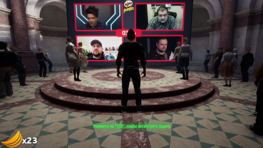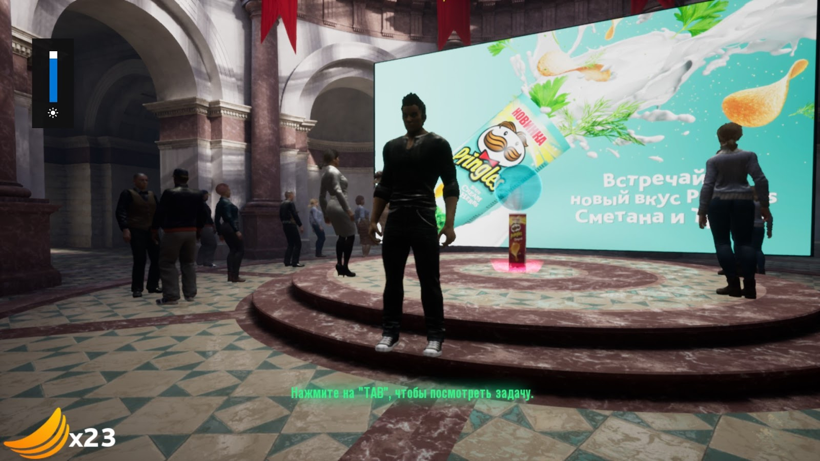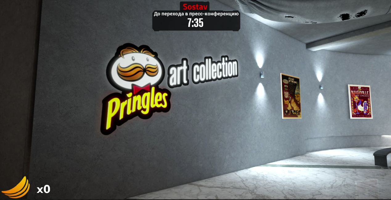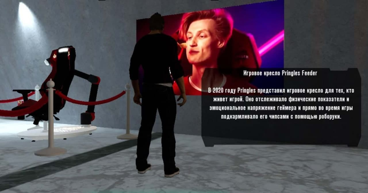 Кроме этого, мы интегрировали вступительный welcome-уровень игры для наших гостей, где можно было погулять по виртуальному музею Pringles, поболтать с NPС-персонажами и даже найти отголоски и пасхалки из мира основной игры. Получилось интерактивное шоу, в котором все действующие лица могли получить нестандартный брендированный опыт в любой точке мира.