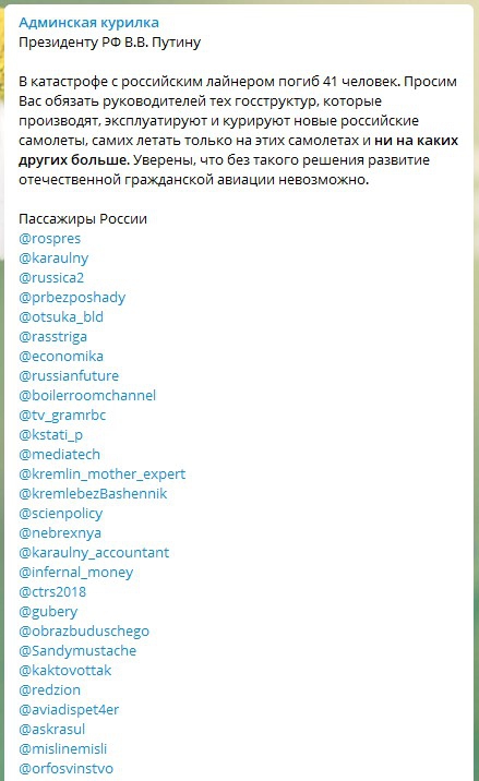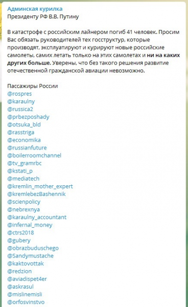 В Telegram также начался сбор подписей под обращением к Президенту РФ с просьбой обязать руководителей тех госструктур, которые производят, эксплуатируют и курируют новые российские самолеты, самим летать только на них.