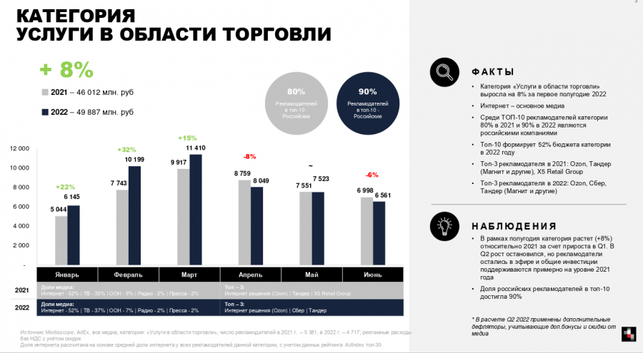 Самая крупная категория как по объёму инвестиций, так и по количеству рекламодателей — «Услуги в области торговли». За первую половину 2022 года она показала рост в 8% за счёт существенного прироста в первом квартале и относительно небольшого снижения во втором.