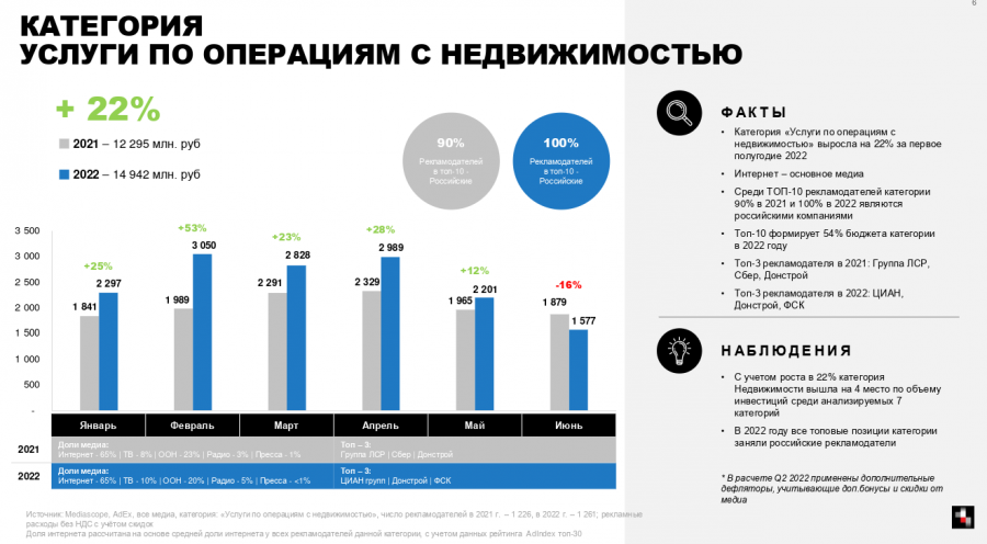 С учётом роста в 22% категория «Услуги по операциям с недвижимостью» вышла на четвертое место по объёму инвестиций среди анализируемых семи категорий. В 2022-ом году весь топ-10 категорий заняли российские рекламодатели, формируя 54% рекламных инвестиций.