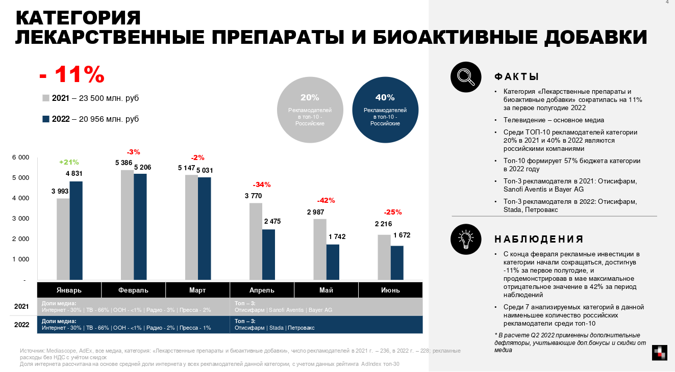 Вторая по объему инвестиций категория из представленных в анализе — «Лекарственные препараты и биоактивные добавки» сократилась на 11% за первое полугодие 2022, продемонстрировав в мае максимальное отрицательное значение в 42% за период наблюдений.