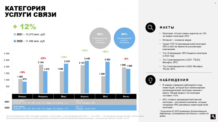 В январе и феврале в категории «Услуги связи» наблюдался спад инвестиций, который был компенсирован рекламодателями начиная с марта. Общий прирост за полугодие составил 12%. При этом 90% топовых рекламодателей данной категории — российские компании, которые генерирую 99% рекламных инвестиций всей категории.