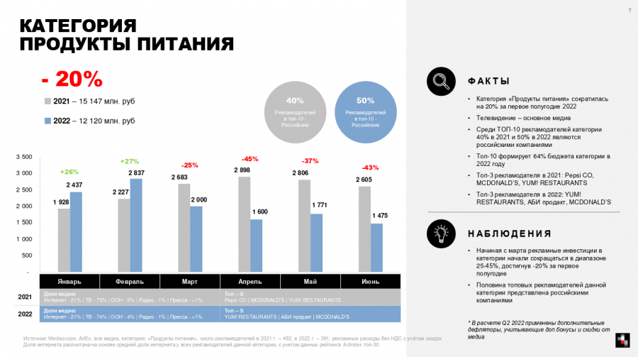 Начиная с марта рекламные инвестиции в категории «Продукты питания» начали сокращаться в диапазоне 25−45%, достигнув 20% за первое полугодие. Топ-10 рекламодателей формируют 64% бюджета категории в 2022. Половина топовых рекламодателей данной категории представлена российскими компаниями.