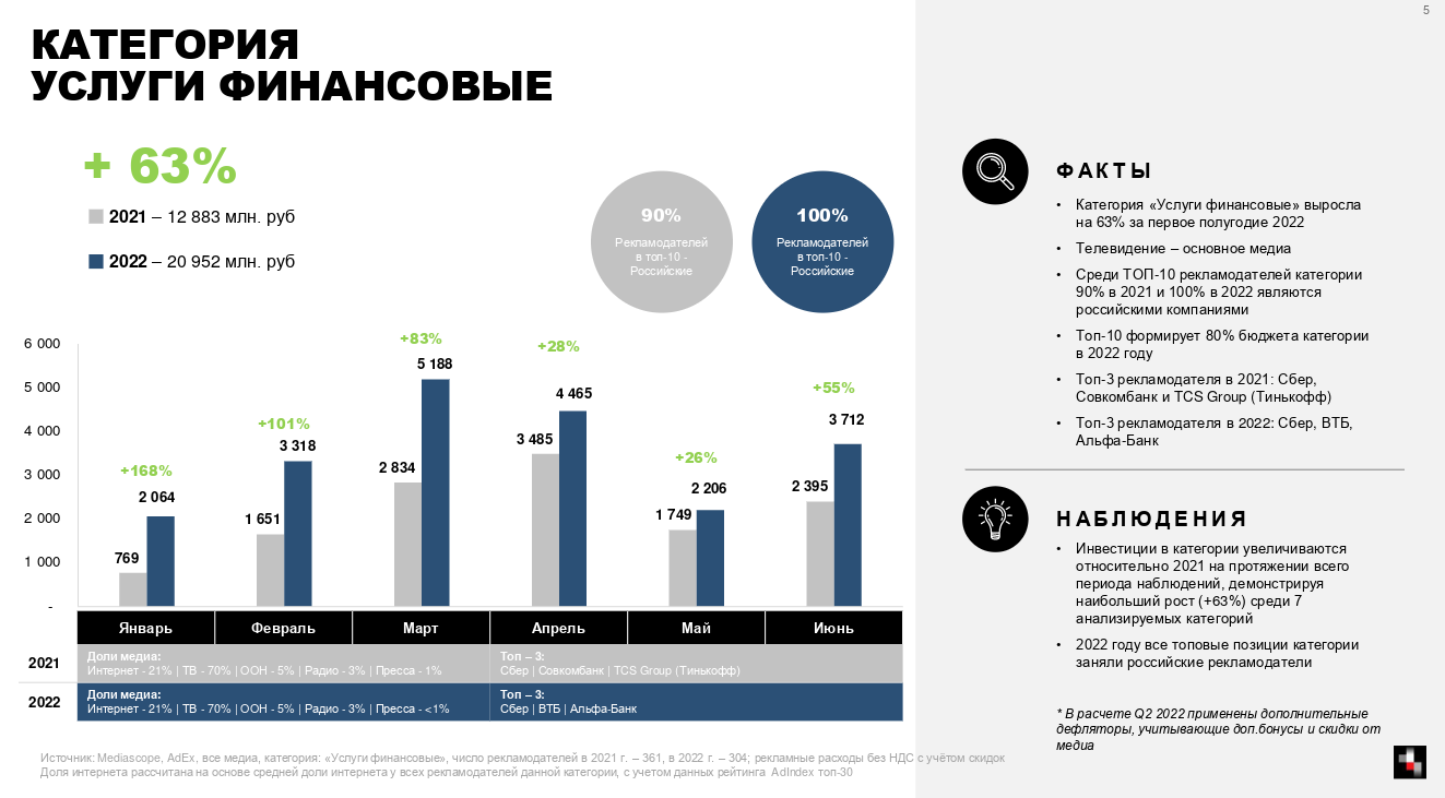 Категория «Услуги Финансовые» продемонстрировала наибольший рост за первое полугодие среди семи анализируемых категорий на 63%. Инвестиции в категории увеличиваются относительно 2021-го на протяжении всего периода наблюдений. В 2022 году все топовые позиции (топ-10) категории заняли российские рекламодатели, формируя 80% рекламных инвестиций.