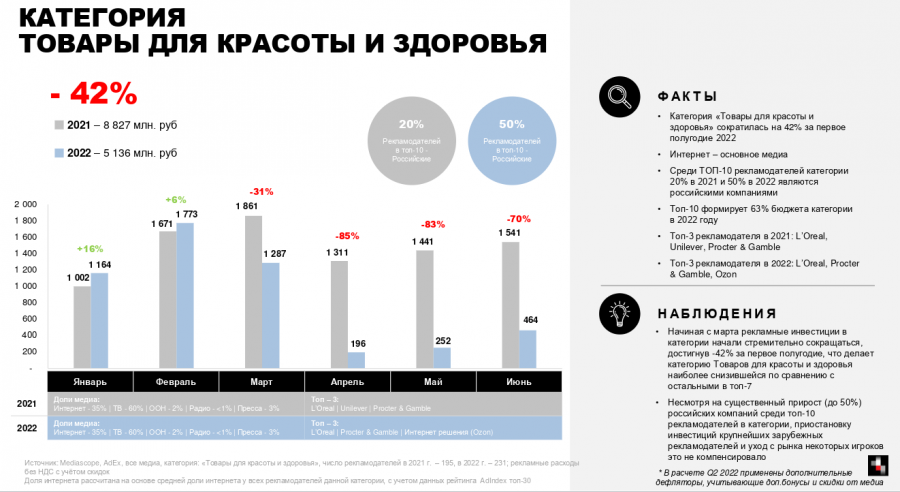 Начиная с марта рекламные инвестиции в категории «Товары для красоты и здоровья» начали стремительно сокращаться, достигнув 42% за первое полугодие, что делает категорию «Товаров для красоты и здоровья» наиболее снизившейся по сравнению с остальными в топе-7.