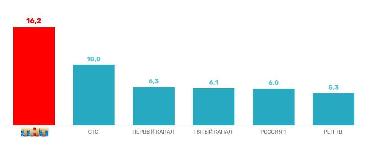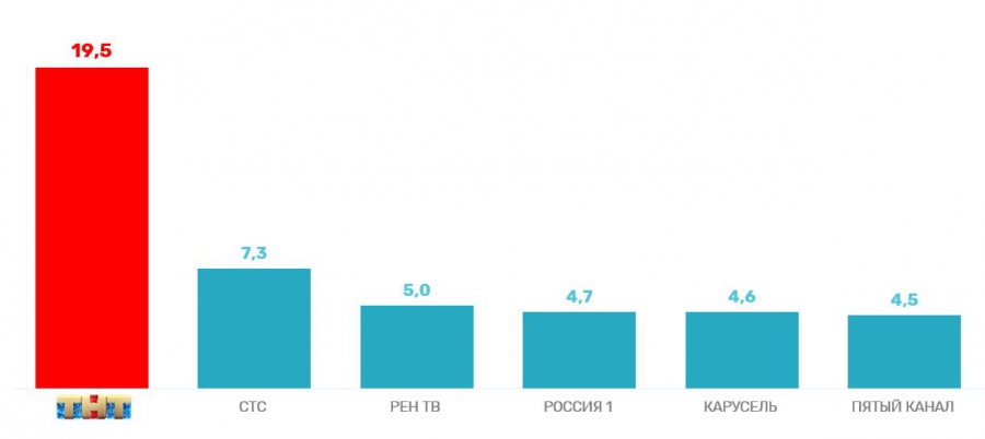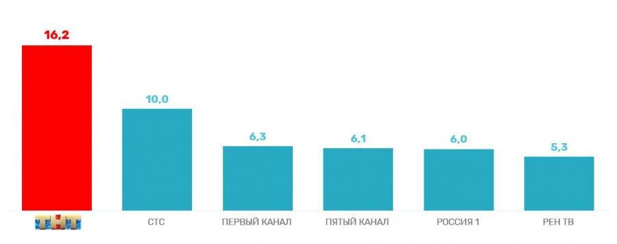 По молодежной аудитории от 18 до 30 лет показатели еще выше: 19,5%. Здесь у ТНТ более, чем двукратное преимущество перед ближайшим конкурентом.