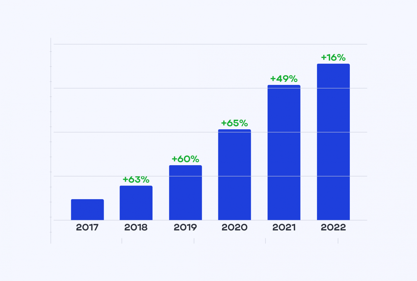Мы видим практическое подтверждение полезности подобного подхода, когда сравниваем показатели отчётных периодов с 2017 года — с начала сотрудничества, и 2022-го — последнего отчётного периода. Мы сделали столбчатую диаграмму, в которой наглядно указали проценты прироста от года к году.