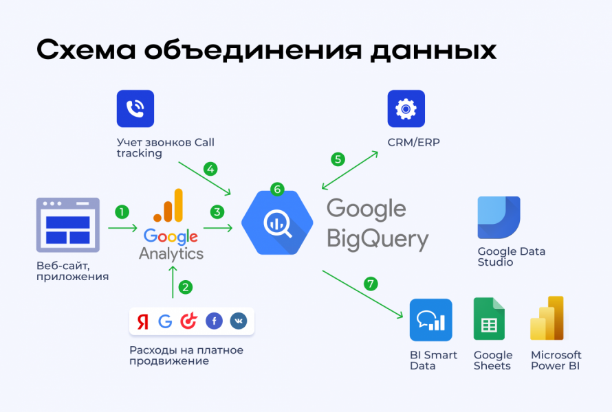 - доступ к объединенным данным в Google BigQuery из всех рекламных, аналитических и бухгалтерских систем.