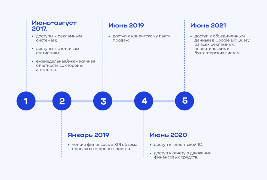 Пункт 3.3. Агентство — партнёр по развитию бизнеса. В этих изменениях нам была отведена отдельная роль: мы составляли рекомендации, как можно улучшить продукт в диджитал-сфере. Со временем такой подход привёл к полноценному партнёрству: клиент занимается непосредственно продуктом, а мы его позиционированием в диджитал.