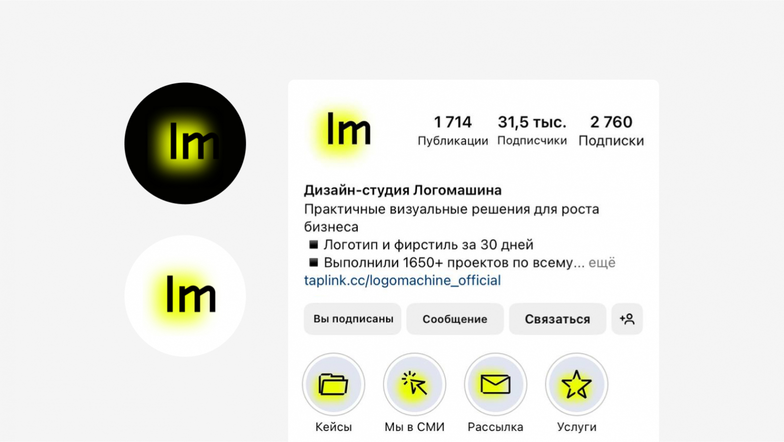 Для соцсетей студии сделали специальную иконку — светящийся жёлтый квадрат и буквы «lm». Оформление постов стало более ярким и современным. Цветовая гамма: жёлтый, чёрный, серый и белый.