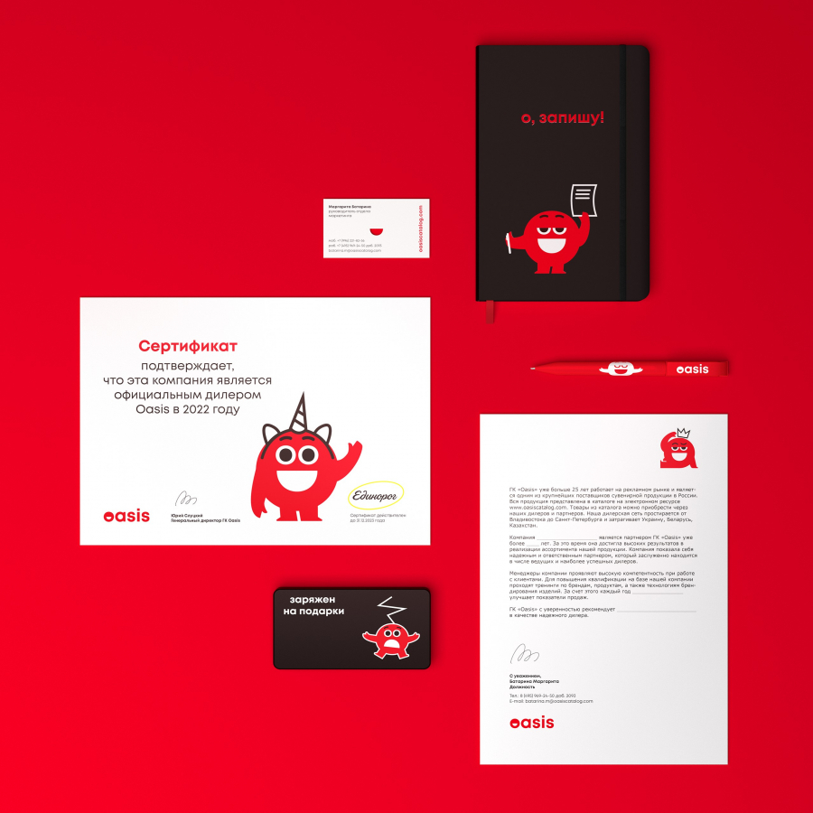 Агентство Otvetdesign разработало концепцию новой айдентики, где сохранило преемственность — красный цвет, разработало логотип и брендбук, а также бренд-персонажа. Глобальная цель Oasis — формировать новую культуру взаимоотношений между игроками рынка подарков и мерча, основанную на бесконфликтности и позитивной эмоциональности. «Oasis не только продает эмоции, но и… дарит их. Работа с Oasis приносит удовольствие и улыбки, которым и решили найти место в фирменном стиле», — поделилась команда агентства.