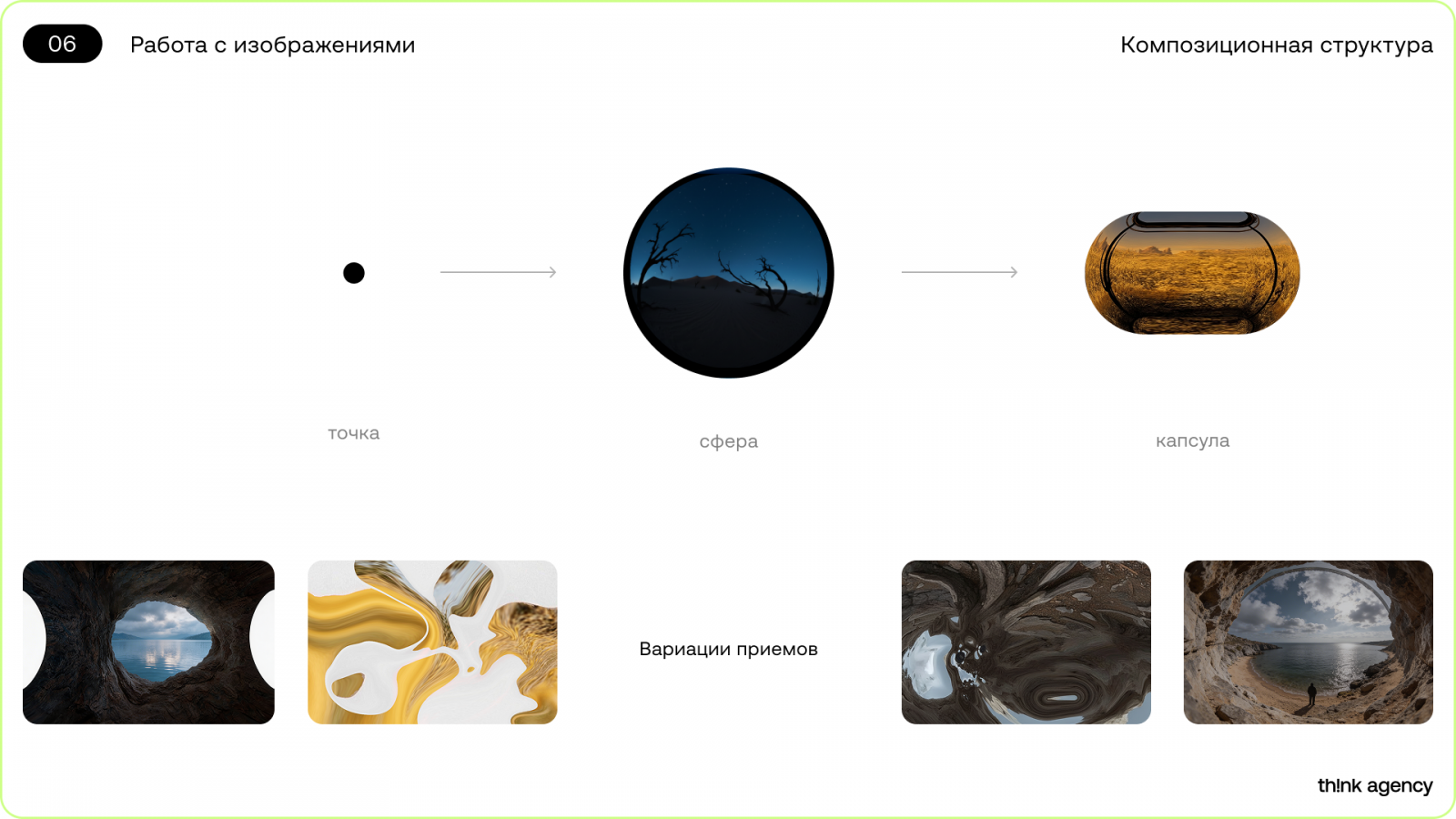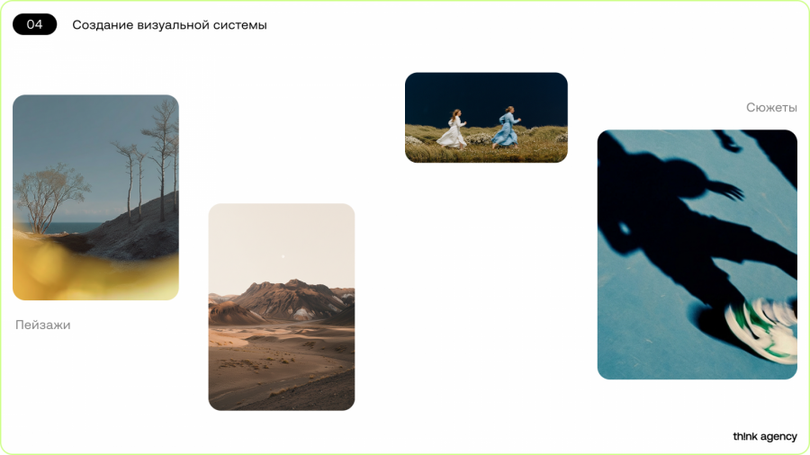 Пейзажи представляют собой кадры с ощущением масштаба и пространства. Они задают глубину сцене и часто служат фоном для графических элементов, органично вписанных в композицию. Пейзажи подчеркивают масштаб и глубину экспертизы компании. Сюжеты отражают живое взаимодействие героев с пространством и друг с другом. Лейтмотивом становитсядвижение, изменение, прикосновение к моменту. Так Think Agency показывает, что развивается и ищет новые решения.