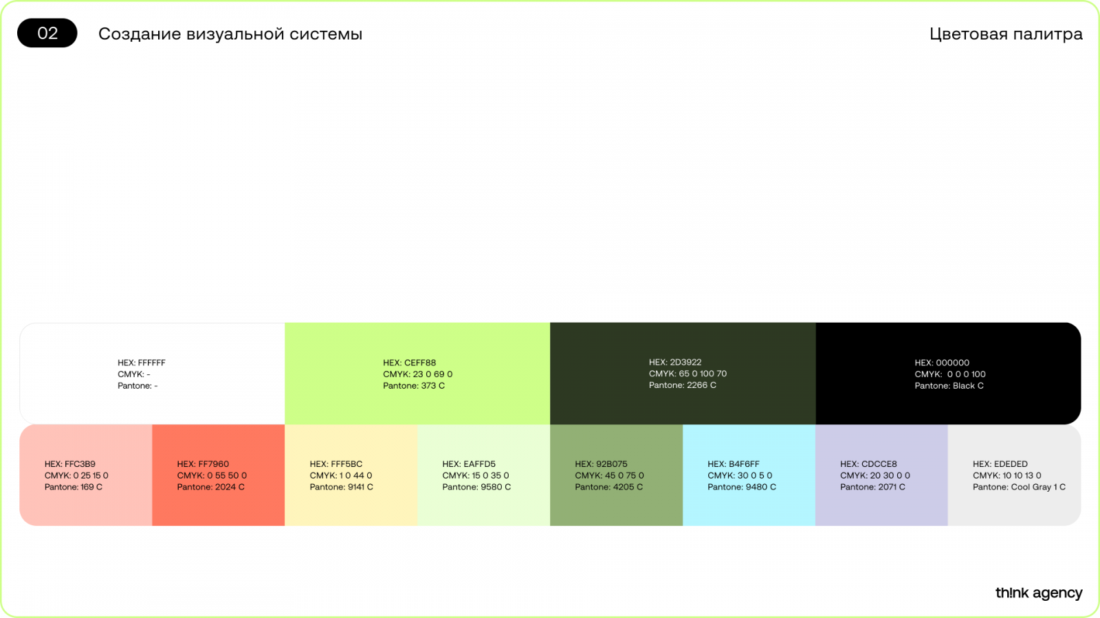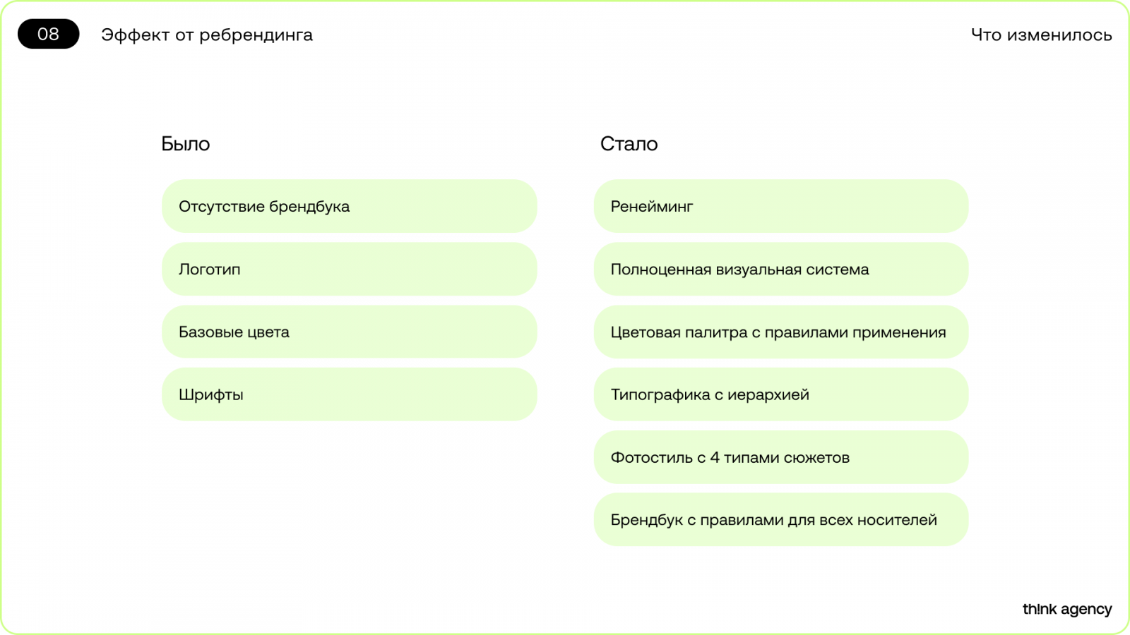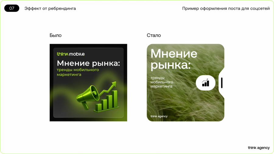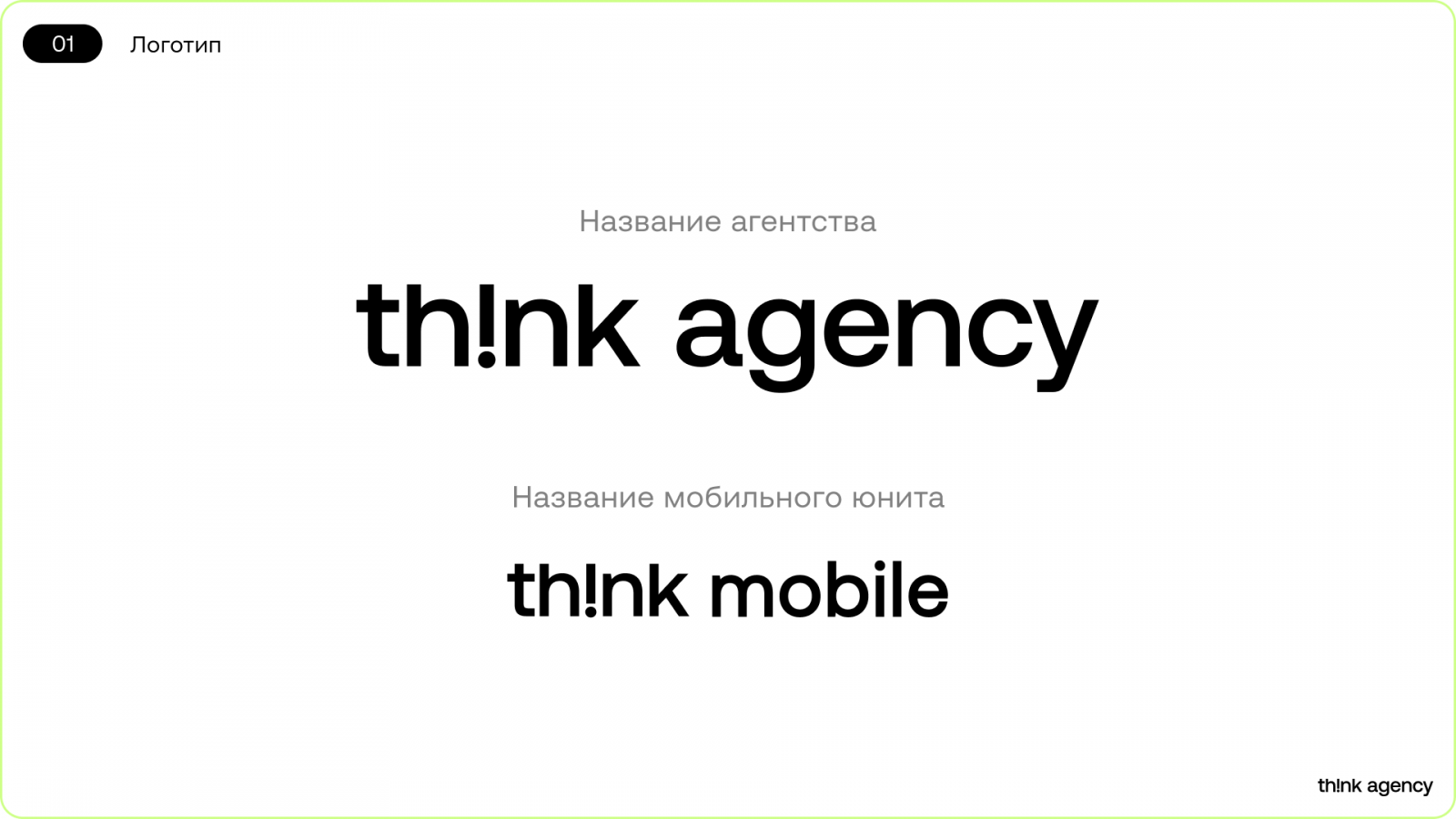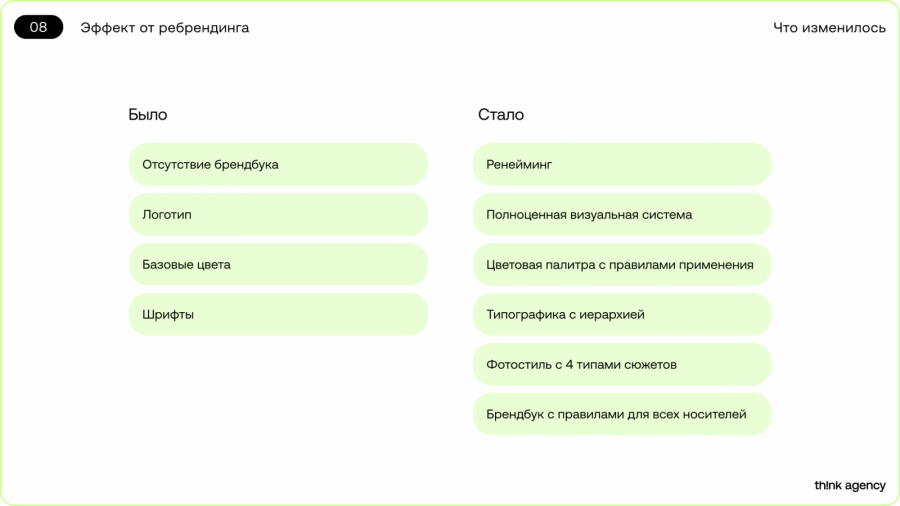 Одна из главных задач ребрендинга состояла в том, чтобы донести наше репозиционирование целостно и корректно, в том числе через нейминг. Переименование в Think Agency стало логичным шагом, поскольку новое название точнее передаёт спектр компетенций.