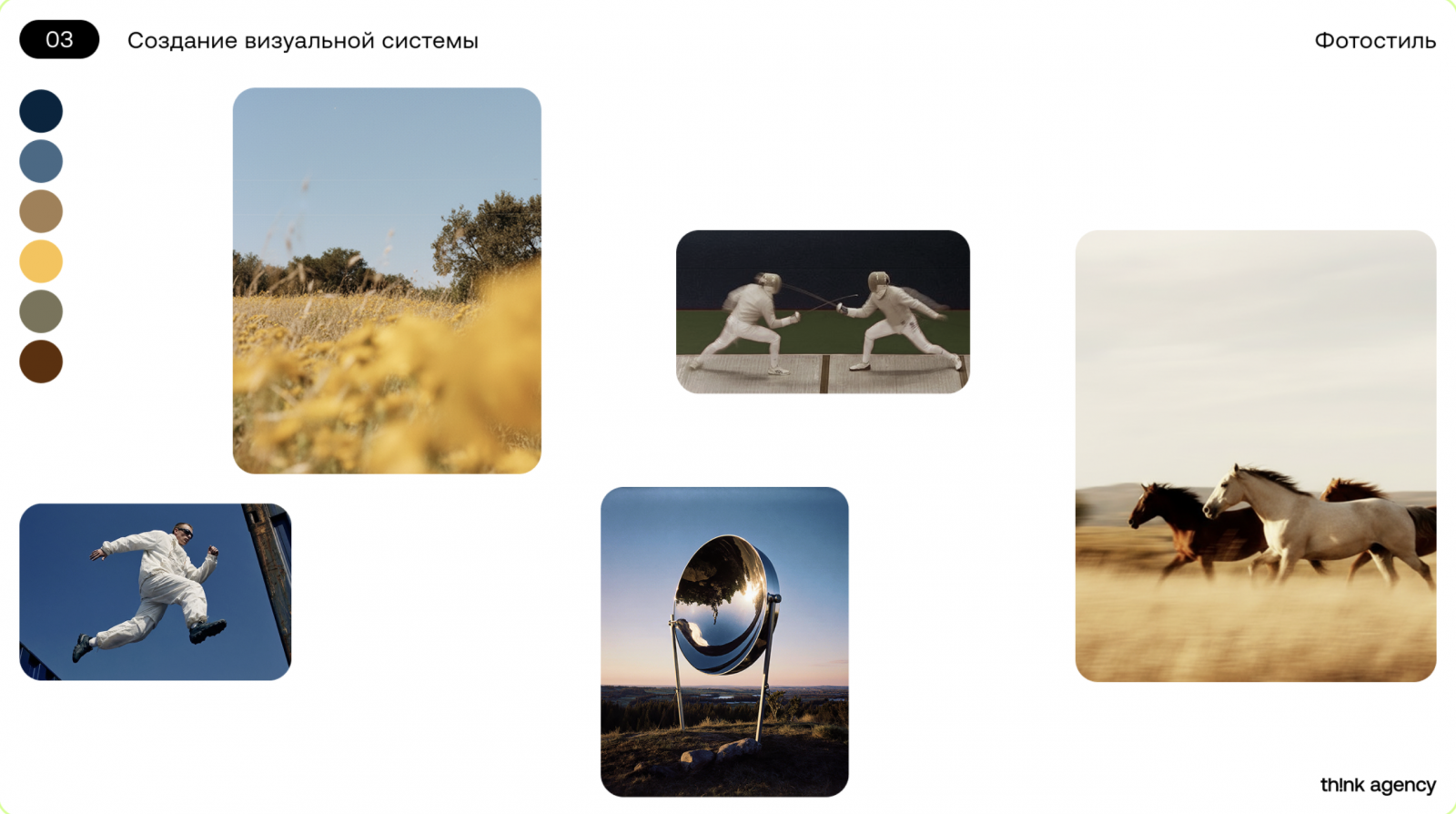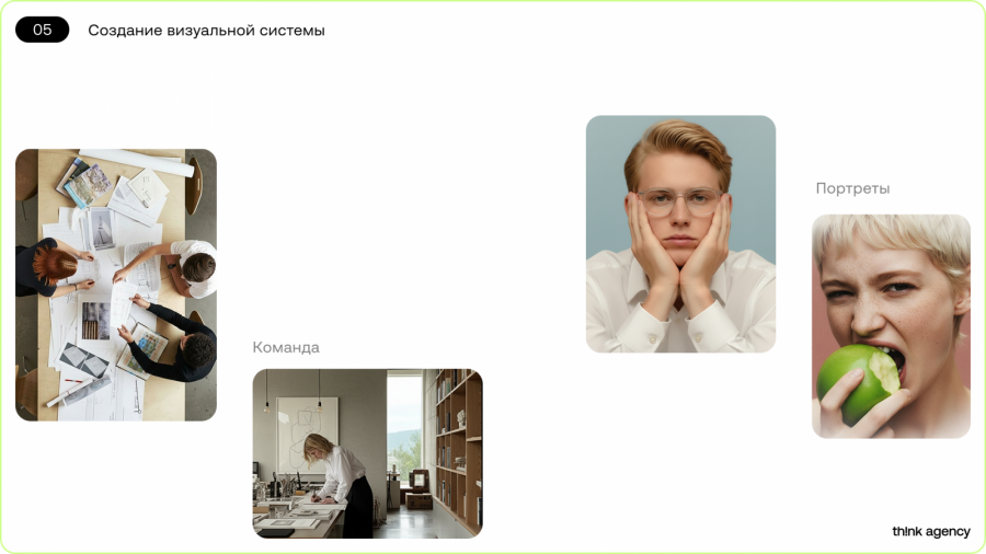 В работе над ребрендингом мы отталкивались от того, что на рынке агентств визуальная коммуникация чаще всего строится вокруг строгой экспертности. Для Think Agency мы выбрали другой подход — работу с эмоциональным спектром, живыми образами и ощущением включенности в каждый момент. Это не просто стилистическое решение, а отражение того, как агентство освобождается от принятых рамок и становится любознательным исследователем цифрового пространства.