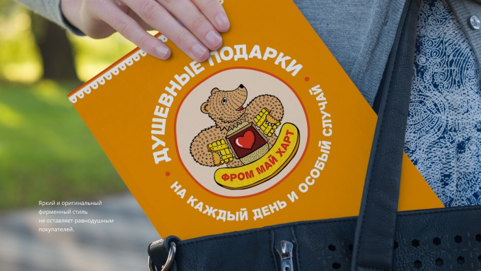 Авторы считают, что к названию «Фром май харт» подходит что-то доброе и «стереотипно» русское. Дизайнеры придумали и нарисовали яркого персонажа – медведя, который с готовностью распахивает дверку на своей груди, демонстрируя широту своего сердца. Подарок от такого героя точно не может быть скучным или неинтересным, уверена команда.