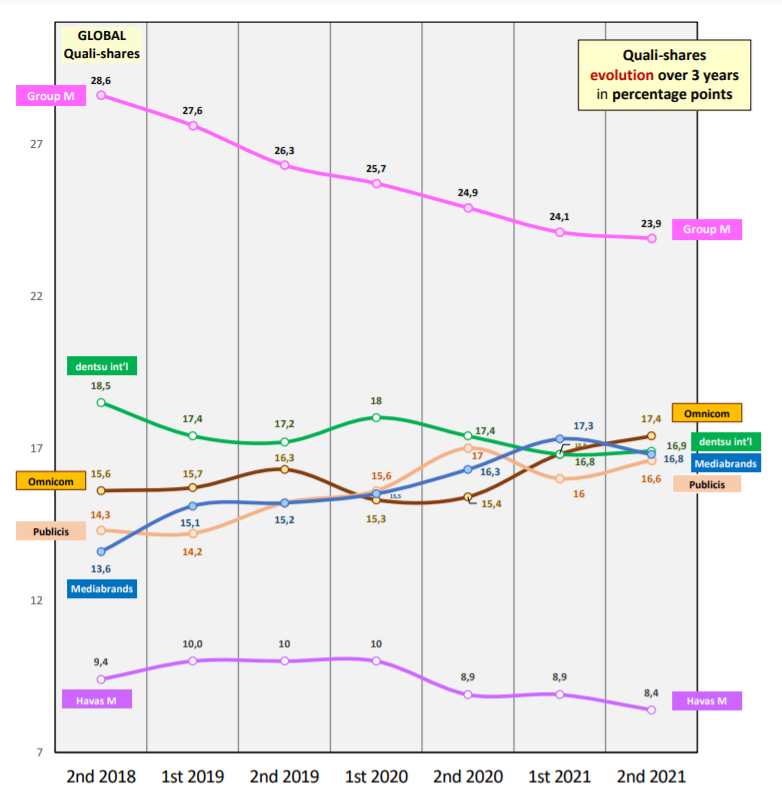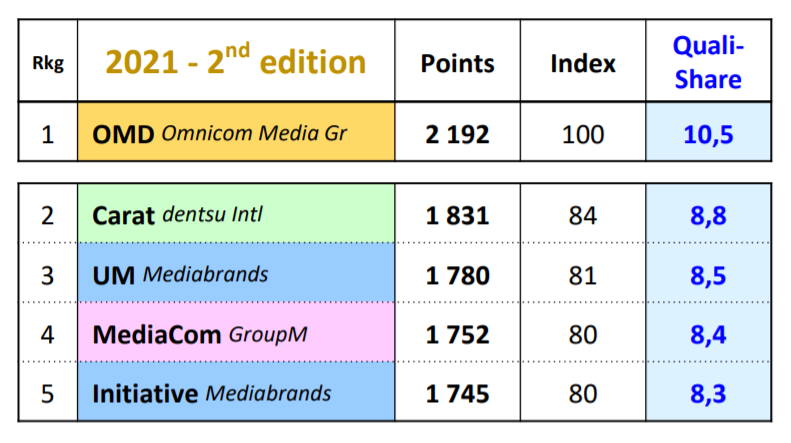 Recma оценивает агентства по множеству параметров и присуждает им очки. По данным исследовательской компании, топ-пять агентств занимают долю в 44,5% от всех очков, присужденных 17 глобальным агентствам без учета незывисимых.