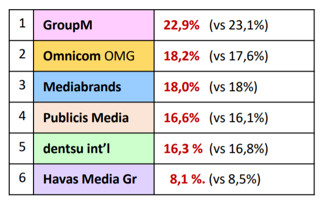Аналогичный рейтинг Recma составила для глобальных рекламных групп. В нём лидирует GroupM.