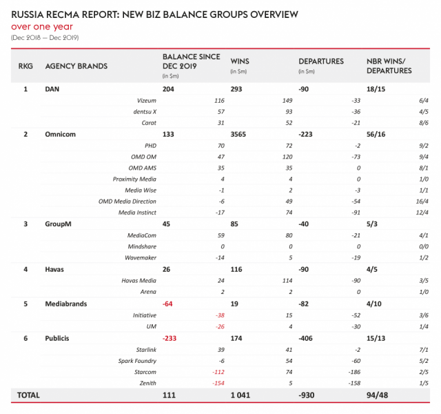 Dentsu Aegis Network . Сумма новых контрактов за вычетом потерянных клиентов DAN за 2019 год составила $204 млн, следует из данных RECMA. При этом получено было контрактов на сумму $293 млн.