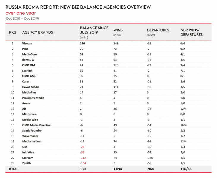 В глобальном рейтинге RECMA по сумме новых контрактов лидирует агентство Carat (принадлежит DAN) с положительным балансом в $1,262 млрд. Второе место заняло агентство