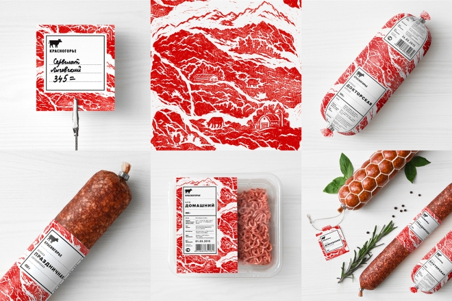 Команда агентства Science разработала дизайн упаковки для торговой марки колбас и мясных деликатесов "Красногорье". Как отмечают авторы, в концепцию упаковки были заложены продуктовые характеристики марки: "на фоне которой размещается отпечаток отборного и сочного куска мяса, выполненный в рукотворной, немного шероховатой технике линогравюры".
