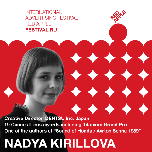 Надя Кириллова, креативный директор, Dentsu Япония Надя родом из Санкт-Петербурга. Объездив весь мир, она остановилась в Японии и в 2007 году присоединилась к Dentsu. Надя работает для широкого ряда клиентов, ее проекты: ‘Connecting Lifelines’ и ‘Sound of Honda / Ayrton Senna 1989’ для Honda’s Internavi, ‘Two Will’ для Sony’s Sony tablet, ‘Car Radio-Personality’ для Tokyo FM, а также ‘2012 Tokyo IMF World Bank Group Annual Meetings’ для Министерства Финансов.