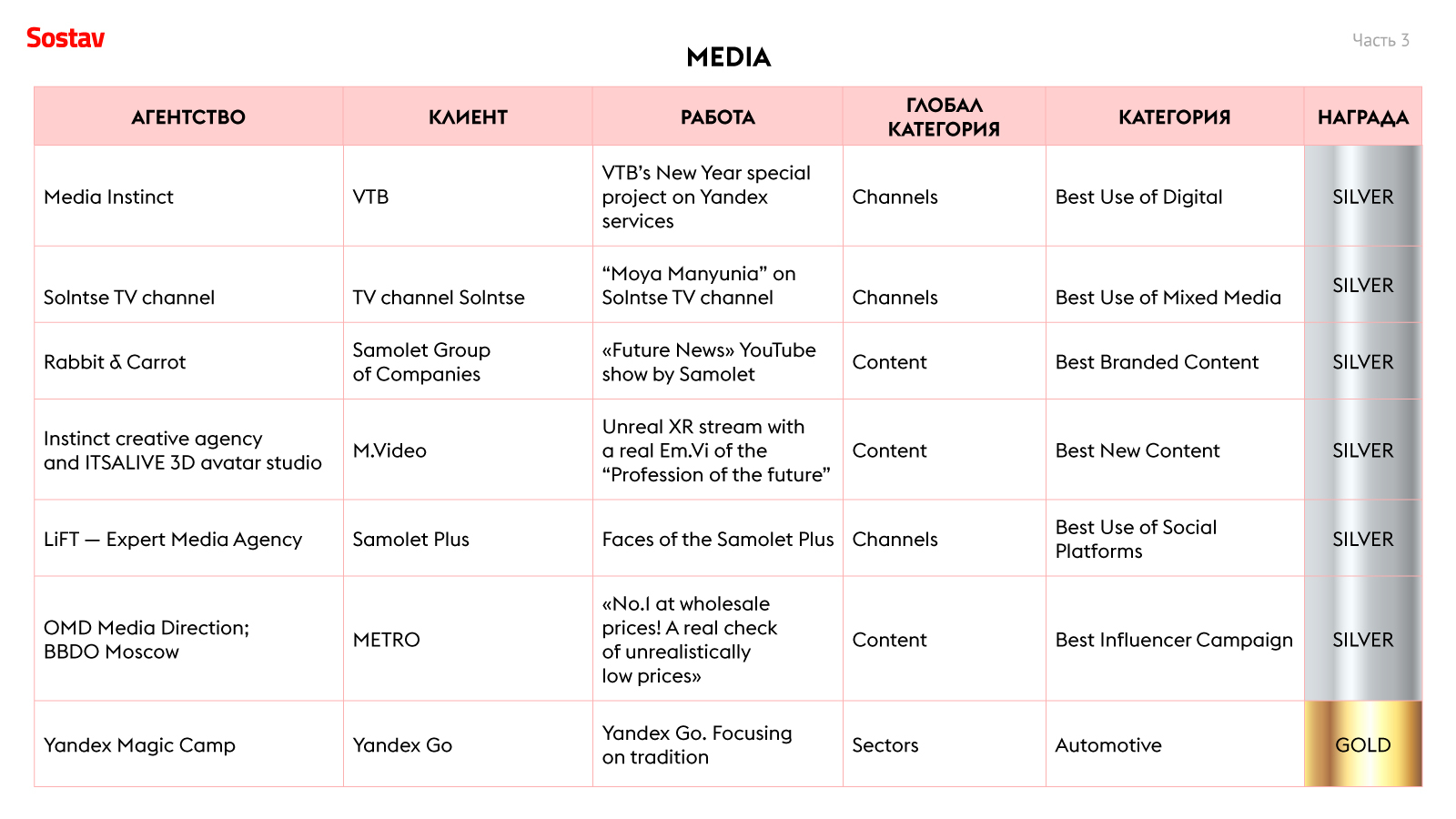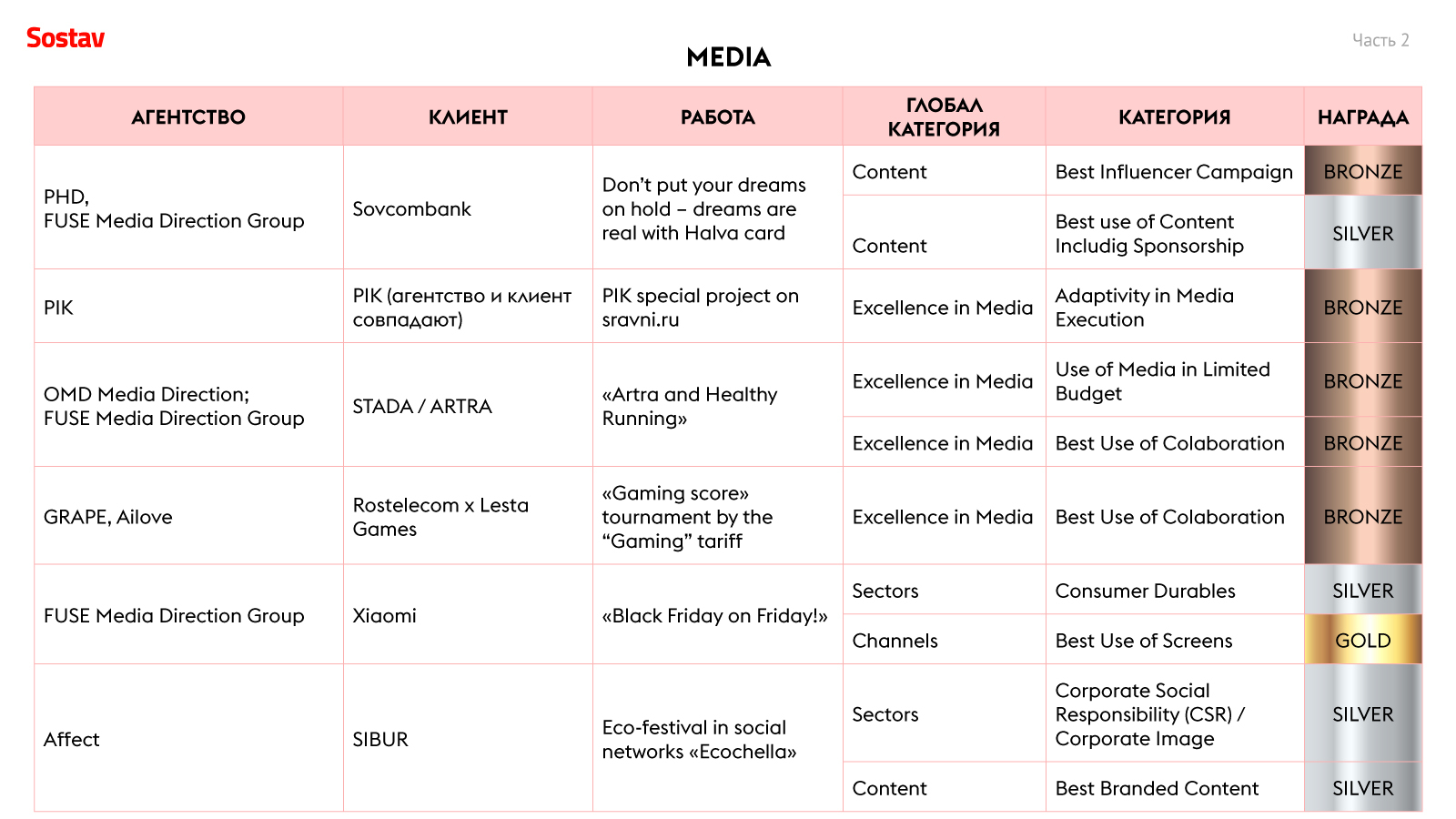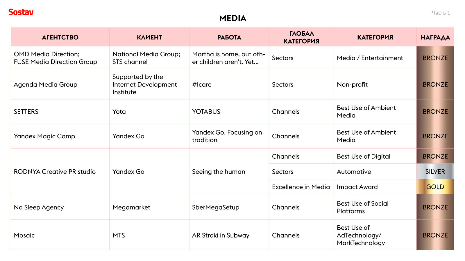 - Специальная награда от Института Развития Интернета (ИРИ) за «Национальные ценности в рекламе» — OMD Media Direction; FUSE Media Direction Group / National Media Group; STS channel — Martha is home, but other children aren’t. Yet…
