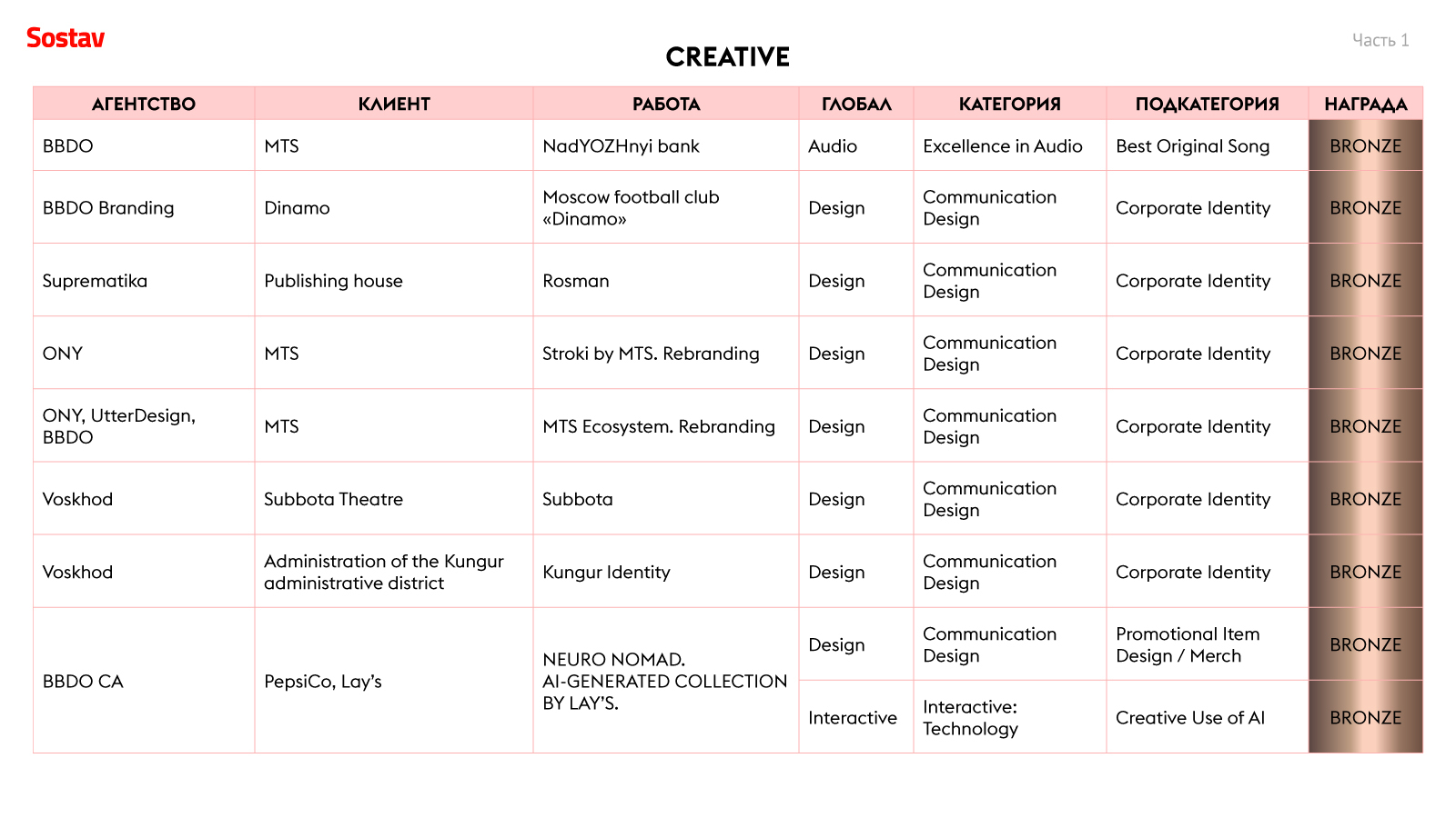 В креативном направлении работа получила серебро в категории Design → Communication Designs → Corporate Identity