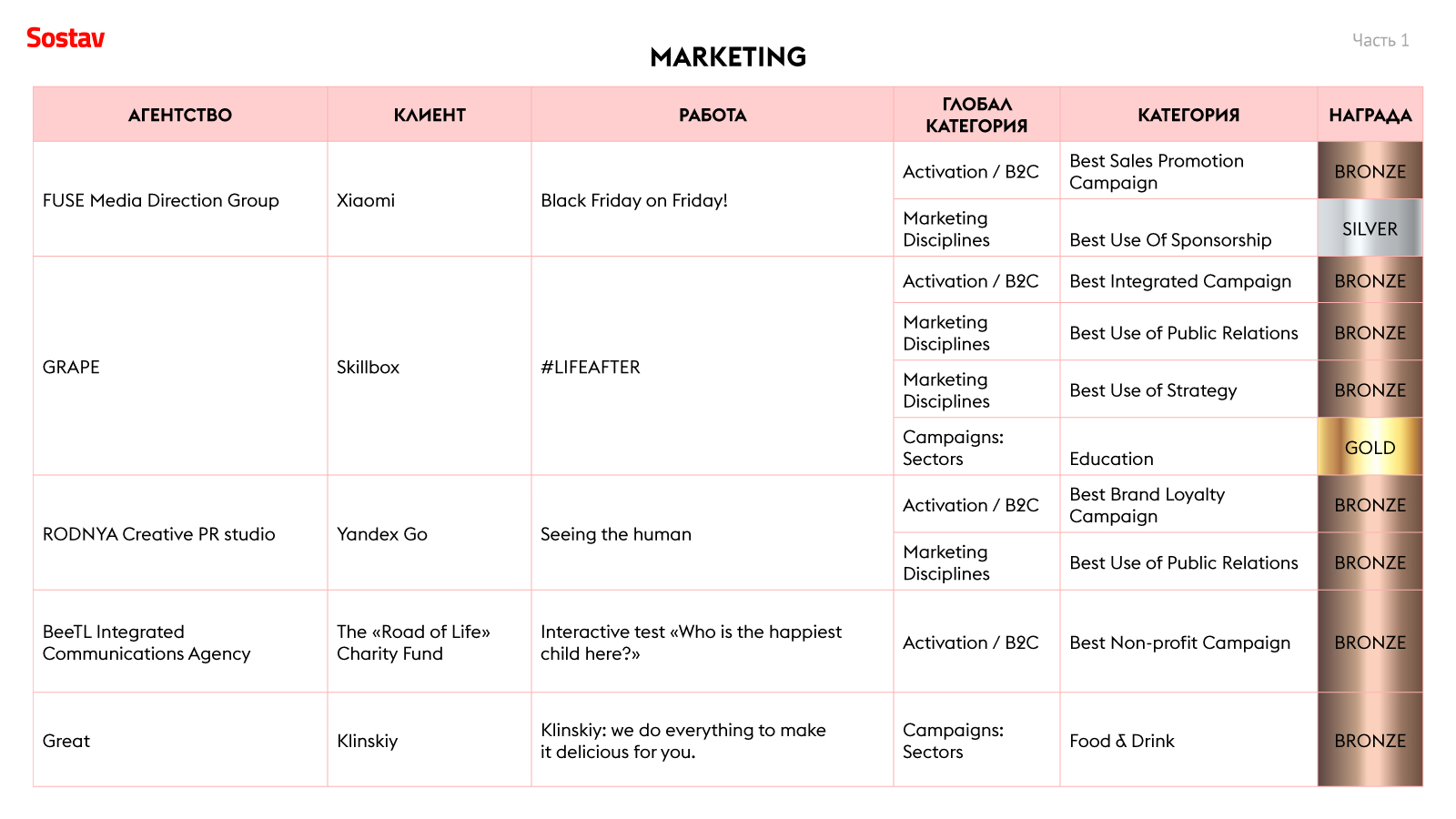 В маркетинговом направлении работа получила золото в категориях Campaigns: Sectors → Retail & Consumer Services и Marketing Effectiveness → Creative Effectiveness