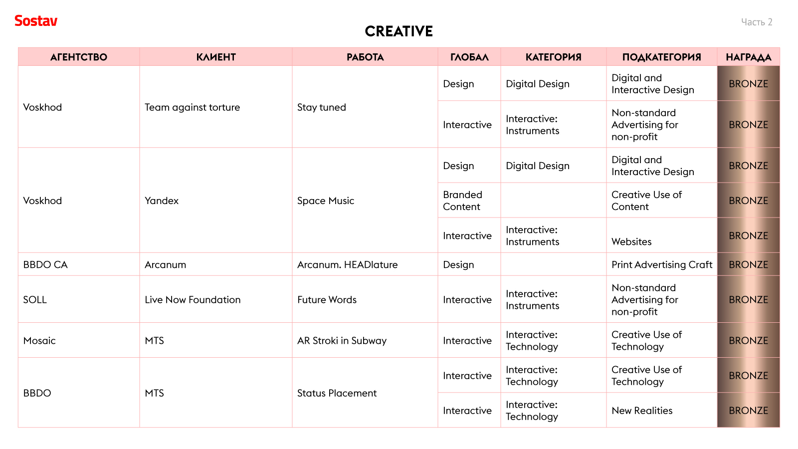 В этом году среди проектов-участников много кейсов, посвящённых возрождению культуры и её внедрению в современность, популяризации искусства и социальным проблемам, а также креативных и эффективных кампаний для брендов.