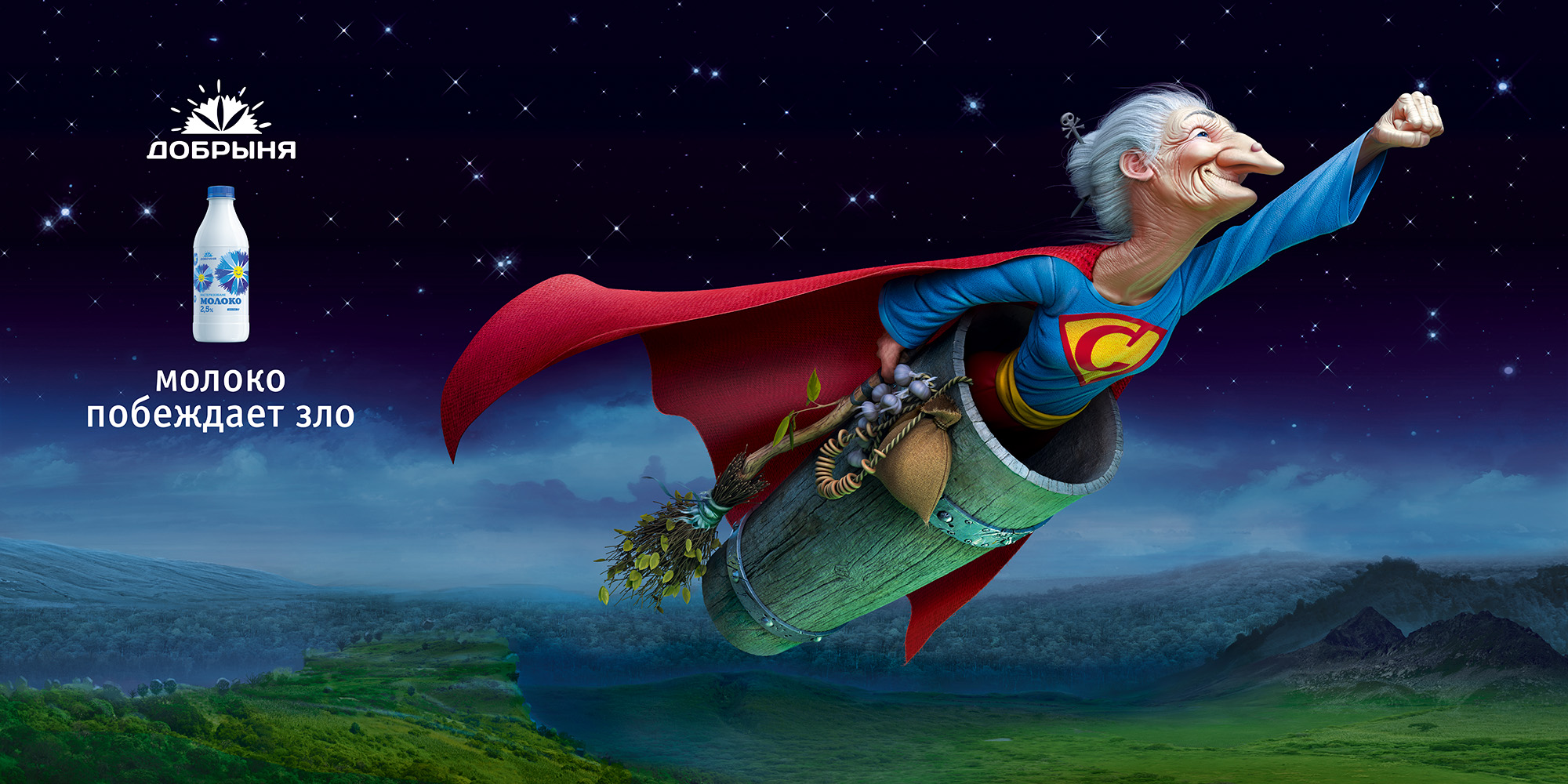 Работа "Супер-Яга" агентства Ogilvy&Mather Ukraine (подкатегория FMCG). Идея работы заключается в том, что традиционно злая и хитрая Баба Яга, выпив стакан молока "Добрыня", превращается в супер-героя и готова творить добро.