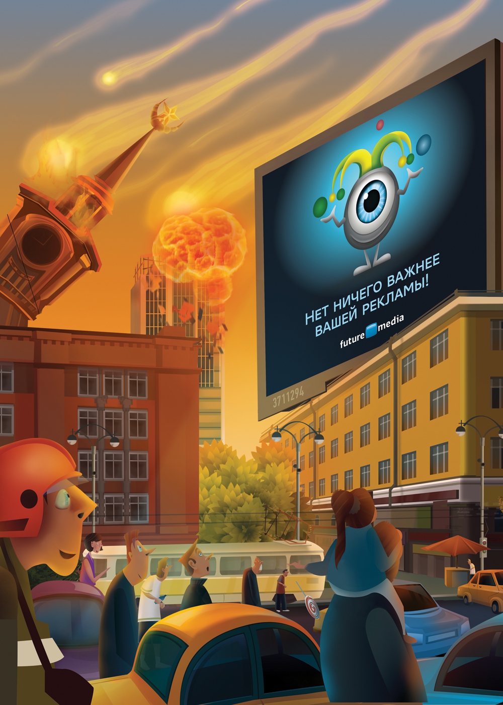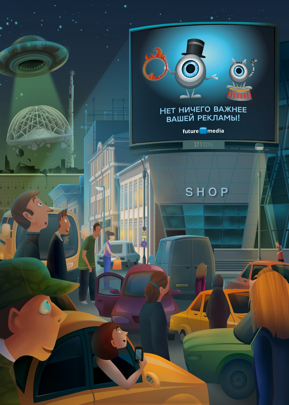 По сюжету принтов, городские жители настолько зачарованны изображением экранов Future Media, что отвлечь их от просмотра рекламы не может ни метеорит, ни НЛО, ни иные признаки зарождения апокалипсиса.