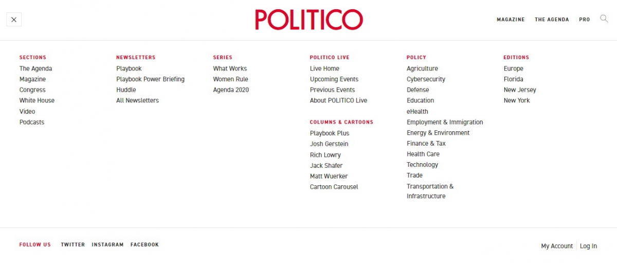 Скорее всего, структура меню Politico была создана со знанием собственного читателя. Мне, как новому посетителю, оказалась удобна система базовых маркеров — шрифт и кегль, а также изображения. Этим маркерам не надо обучать новичка, поэтому они будут работать всегда.