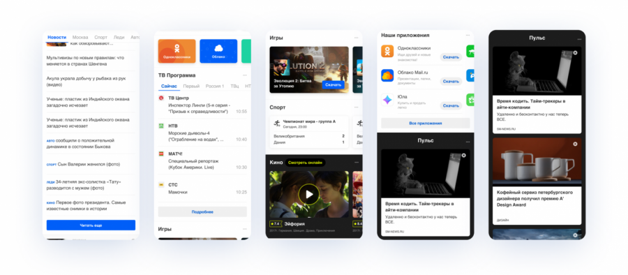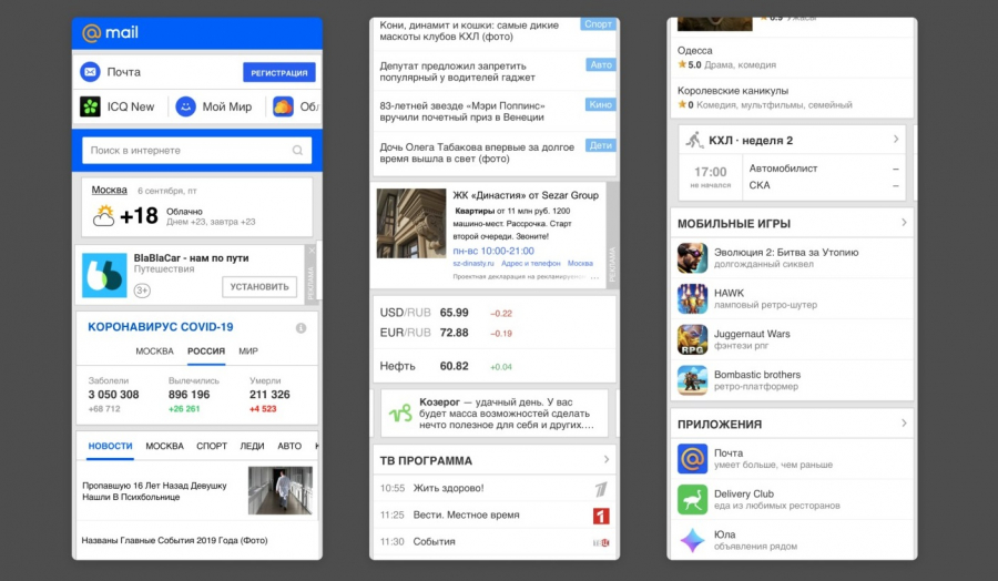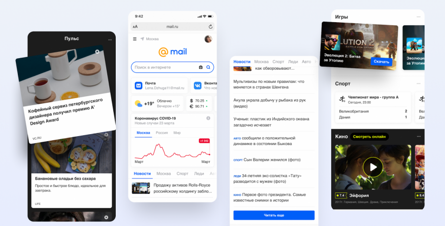 Например, для «Кино Mail.ru» сделали темную подложку — так мультимедийный контент удобнее воспринимать. Для игр добавили большие карточки с обложкой, на которых заметны обновления. Телепрограмме добавили удобное переключение между каналами, чтобы пользователю было проще найти передачи, которые его интересуют. Еще мы недавно внедрили «Пульс» — персональную ленту рекомендаций. На новой главной мы немного изменили ее стиль, добавили темный фон, что увеличило кликабельность.