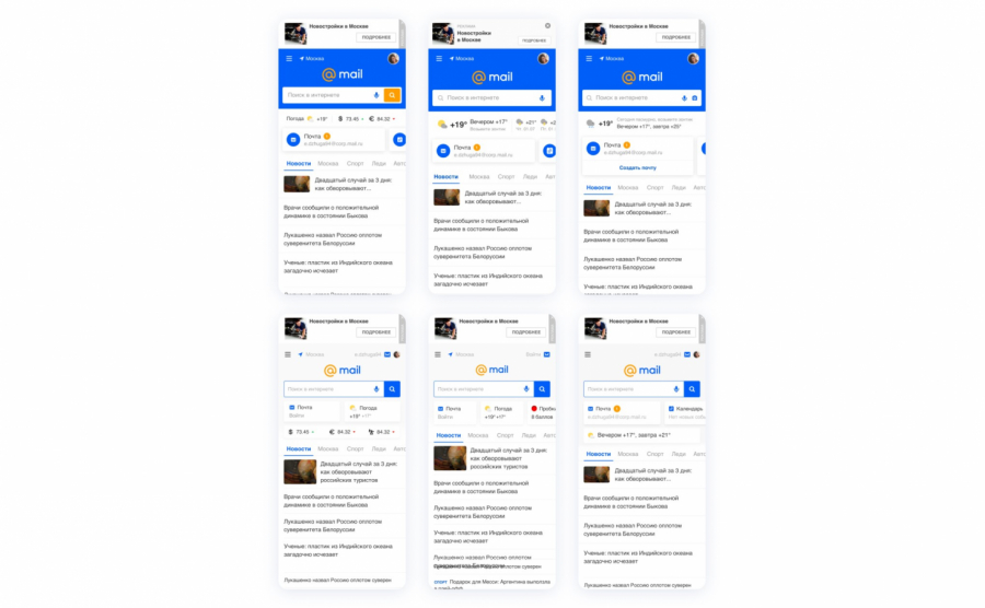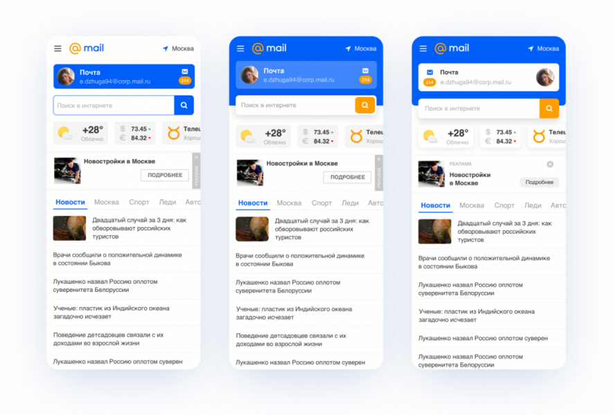На первом этапе разработали три варианта главной страницы. Видна одинаковая последовательность блоков: «Почта» вверху, «Поиск» посередине, затем реклама и «Новости». Мы убрали из первого экрана все неприоритетные элементы, чтобы сфокусировать внимание пользователя на ключевых продуктах и не отвлекать от «Почты» и «Поиска». В этих вариантах глобально мы изменили только UI, частично применили нашу новую дизайн систему, а именно: закруглили блоки и кнопки, добавили тень и сделали виджеты погоды и котировок, но оставили много акцентного цвета.